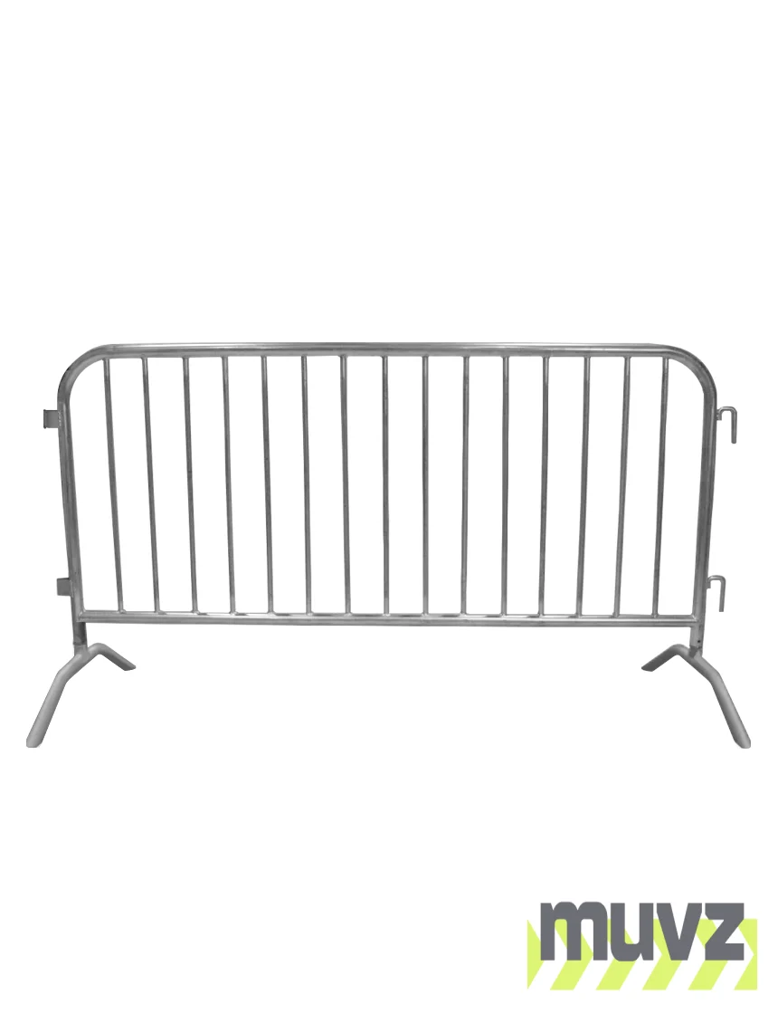 Muvz Steel 6.5" Crowd Control Barriers are made of heavy duty galvanized steel and come with your choice of two styles of detachable feet - Bridge and Flat Styles. These Steel barriers are used for crowd control at events, concerts, rallies or wherever organizing and managing the flow of crowd and pedestrians is a requirement. The frames of the barriers are made with 1.5 inch 16 Gauge Galvanized Steel and the upright spindles are spaced 4 inches apart and made of 5/8 galvanized 19 Gauge Steel.