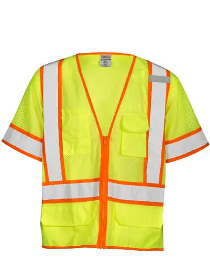 This class 3 safety vest provides maximum visibility for workers exposed to inclement weather and traffic traveling above 50mph -- including roadway and railway construction, utility crews, highway surveyors and first responders. Made from 100 percent polyester Ultra-Cool mesh. Dual frontside and backside 2-inch wide reflective stripes with contrasting edges.