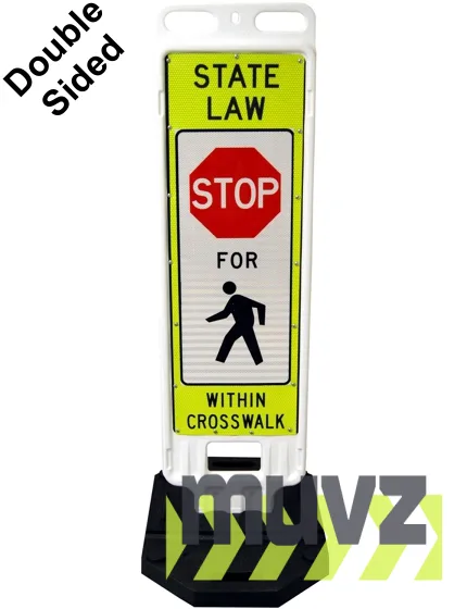 12"x36" Reflective Lime, STATE LAW STOP FOR PEDESTRIANS WITHIN CROSSWALK VP Barricade w/28 Lb. Base