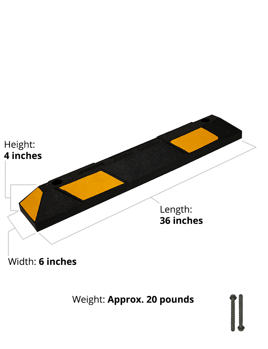 Made from extremely durable 100 percent post-consumer tires, the 3-foot rubber parking block holds up to harsh weather and vehicle impact. They flex slightly to lie flat on uneven surfaces making them a great option for older asphalt and gravel. Reflective striping offers maximum nighttime visibility.