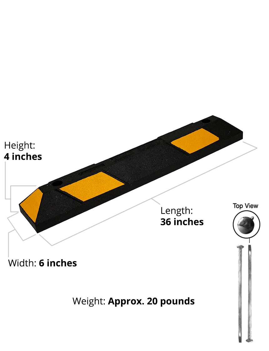Made from extremely durable 100 percent post-consumer tires, the 3-foot rubber parking block holds up to harsh weather and vehicle impact. They flex slightly to lie flat on uneven surfaces making them a great option for older asphalt and gravel. Reflective striping offers maximum nighttime visibility.