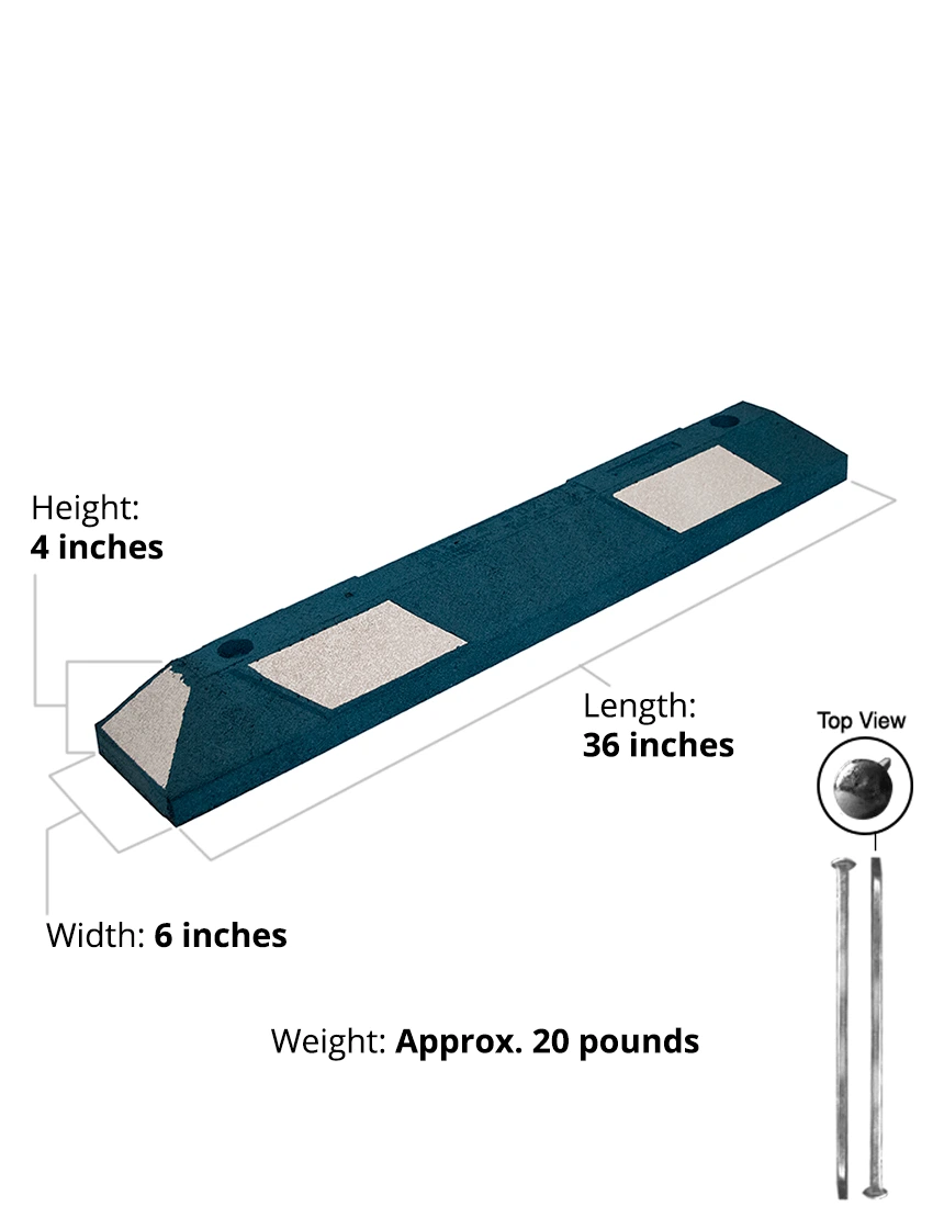 Made from extremely durable 100 percent post-consumer tires, the 3-foot rubber parking block holds up to harsh weather and vehicle impact. They flex slightly to lie flat on uneven surfaces making them a great option for older asphalt and gravel. Reflective striping offers maximum nighttime visibility.
