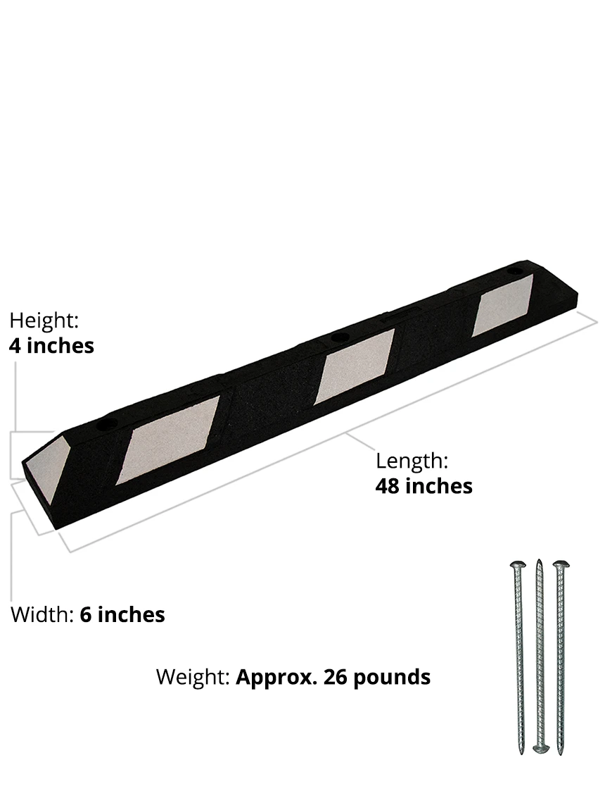 4' Recycled Rubber Parking Block w/White Reflective Tape & 14" Rebar Spikes for Asphalt or Gravel