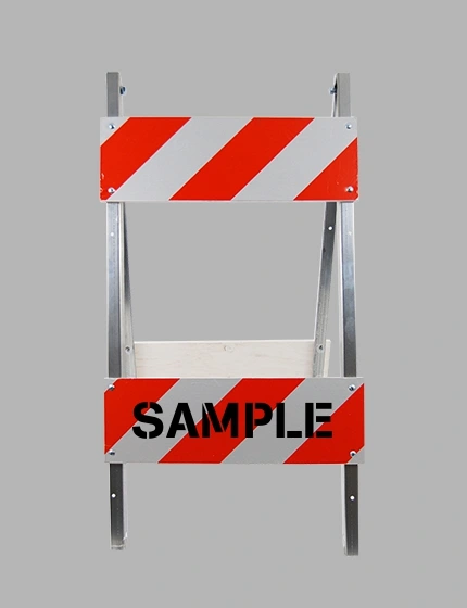 Economy Wood and Steel barricades are sturdy, ease to set up, fold, and store. Available as a Type 1 Barricade with reflective material on the top boards or as a full Type 2 Barricade with reflective sheeting on both the top and bottom boards. These Barricades are 45" tall and 24" wide, the Type 1 configuration has 8" board on top and 6" board on the bottom while the Type 2 has 8" board on the top and bottom of the Barricade. Made from galvanized steel and wood with reflective orange stripes that won't fade in the sun. These Type I and Type II Barricades are available with Engineer Grade or High Intensity Reflective Sheeting. Add your company name or logo or a warning message at no additional set-up cost. Made in U.S.A.