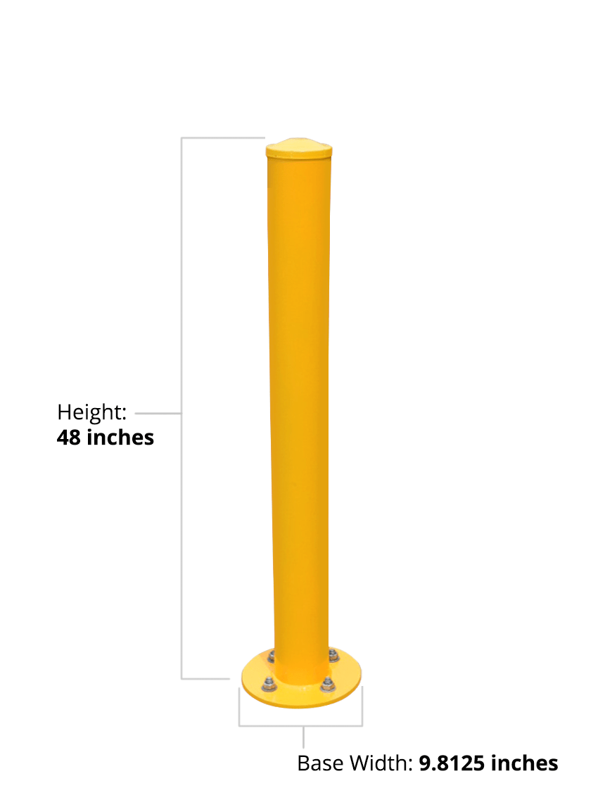 Muvz round base, "Bolt Down" bollards are made of high quality, schedule 40, heat galvanized carbon steel pipe, with welded bases that are then Powder Coated in High Visibility Yellow, and made to take the hits.