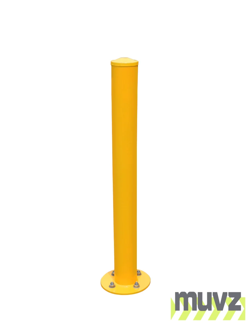 Muvz round base, "Bolt Down" bollards are made of high quality, schedule 40, heat galvanized carbon steel pipe, with welded bases that are then Powder Coated in High Visibility Yellow, and made to take the hits.