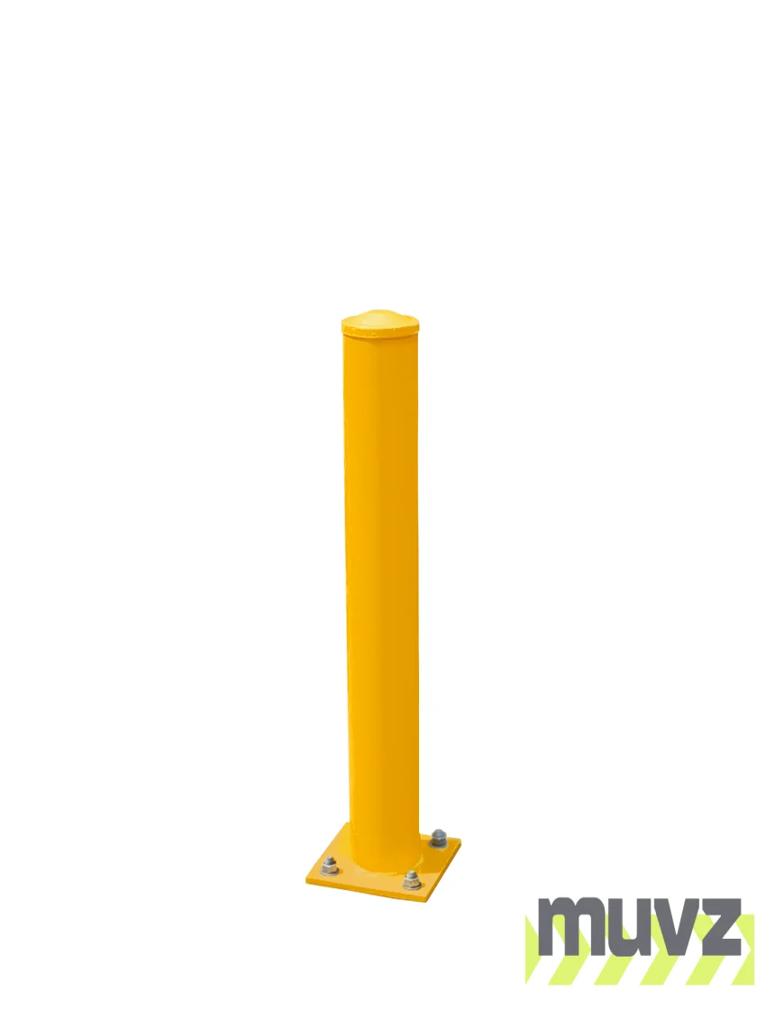Muvz square base, "Bolt Down" bollards are made of high quality, schedule 40, carbon steel pipe, with welded bases that are then Powder Coated in High Visibility Yellow, and made to take the hits.