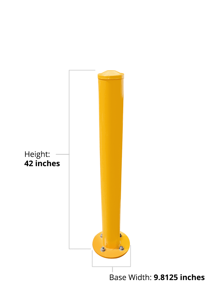 Muvz round base, "Bolt Down" bollards are made of high quality, schedule 40, carbon steel pipe, with welded bases that are then Powder Coated in High Visibility Yellow, and made to take the hits.