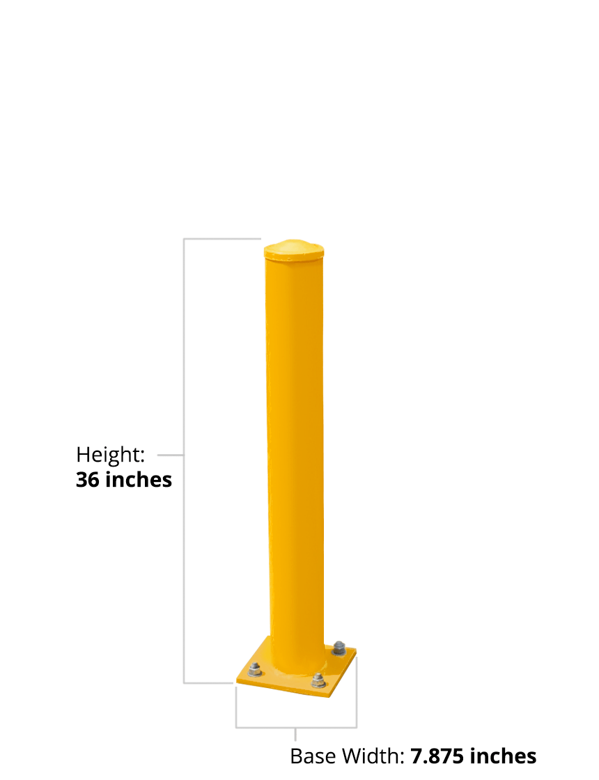 Muvz square base, "Bolt Down" bollards are made of high quality, schedule 40, carbon steel pipe, with welded bases that are then Powder Coated in High Visibility Yellow, and made to take the hits.