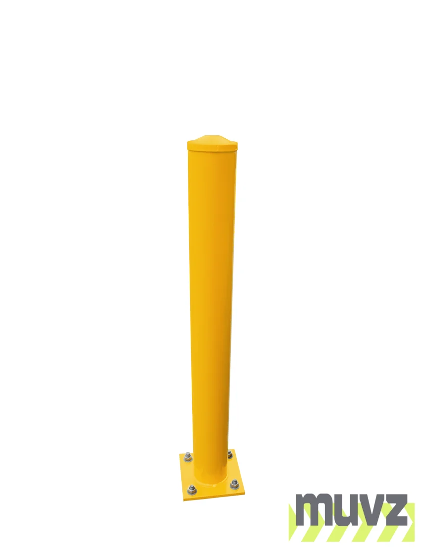 Muvz square base, "Bolt Down" bollards are made of high quality, schedule 40, carbon steel pipe, with welded bases that are then Powder Coated in High Visibility Yellow, and made to take the hits.