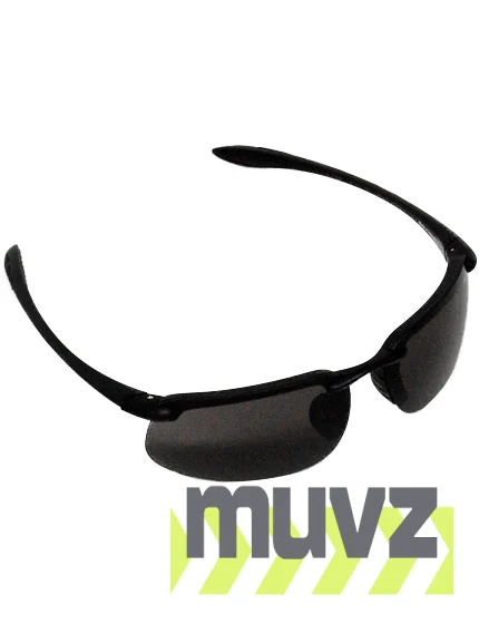 Sturdy black sports frames with dark or neutral gray lenses. These safety sunglasses save eyes from sunlight, refuse and chemical exposure. Worn by forklift operators, lifeguards, and urban construction workers. Also appropriate for skiing, water sports and volleyball. Meets Safety Requirements: ANSI Z87+