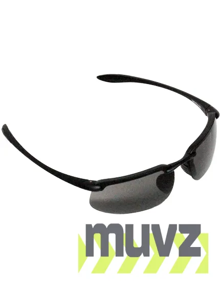 Sturdy black sports frames with dark or neutral gray lenses. These safety sunglasses save eyes from sunlight, refuse and chemical exposure. Worn by forklift operators, lifeguards, and urban construction workers. Also appropriate for skiing, water sports and volleyball. Meets Safety Requirements: ANSI Z87+